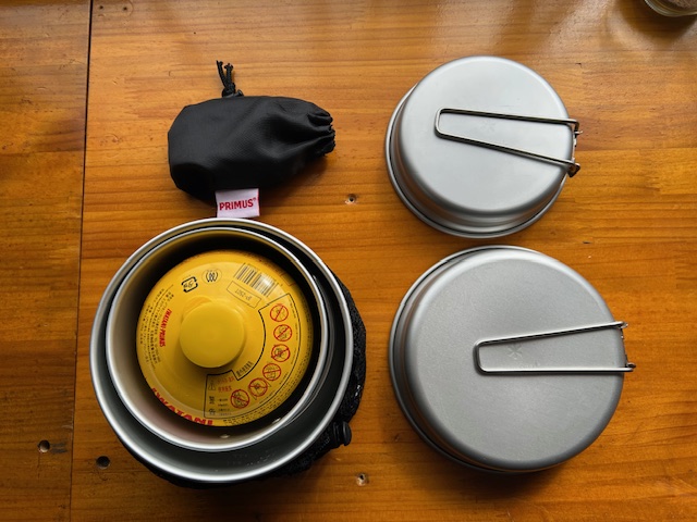 プリムスのソロクッカー、ライテック トレックケトル&パンに250のOD缶と、プリムスのフェムトストーブを収納した写真です。