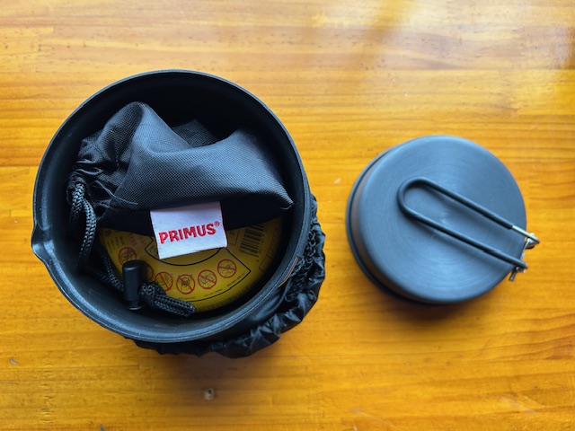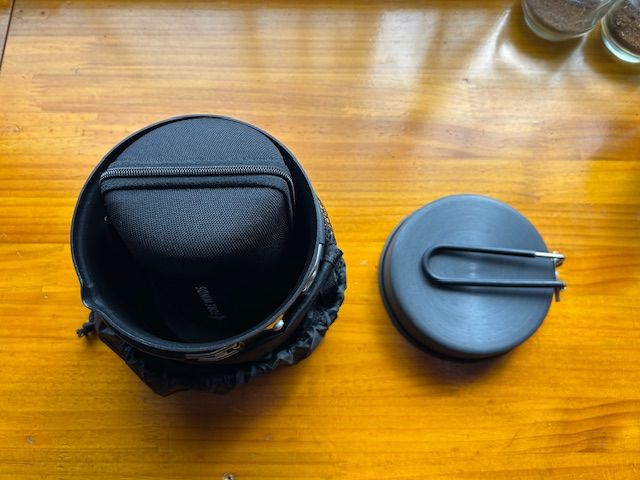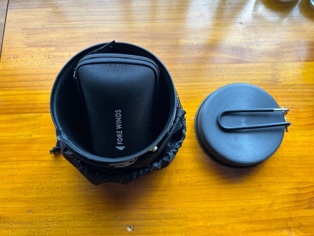 ちなみに、ライテック トレックケトル&パンにFORE WINDSのコンパクトキャンプストーブをハードケースごと収納した写真です。