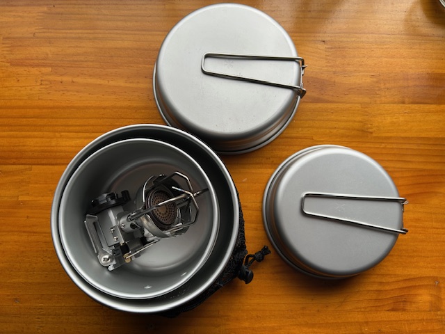 ライテック トレックケトル&パンにマイクロキャンプストーブをハードケースごと収納した写真です。