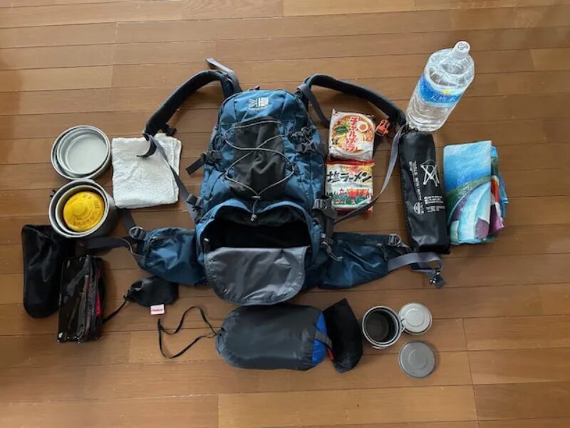 これがYobo爺のバックパック:カリマーのdaleという今は廃番になっている28Lのバックパック(写真中央)と防災用品です。