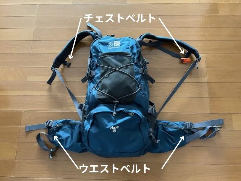 また、胸の部分にあるチェストベルトが付いていることによって、ショルダーベルトがズレることなく快適に歩くことが可能になりますので、それらのベルトが付いているバックパックをおすすめします。