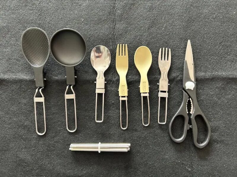 カトラリー類は全て100円ショップで揃えたものですが、使い勝手はアウトドアメーカーのものと遜色ありません。