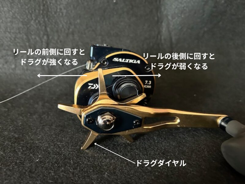 ※右ハンドルと左ハンドルではドラグの操作が逆になるが、基本的にはリールの前側(ラインが引き出される側)に回すとドラグが強くなり、後ろ側に回すとドラグが弱くなる。
