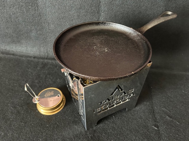 Yobo爺が使っているのはエスビットのアルコールバーナーで、火力調整用の蓋に取っ手が付いているので、火傷の心配が少なくて気に入っています。