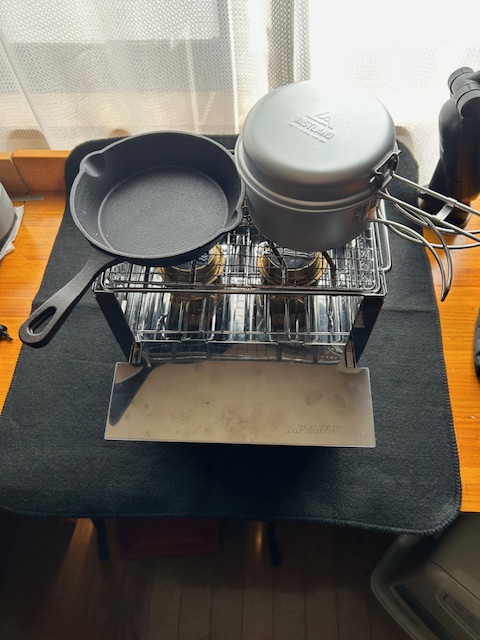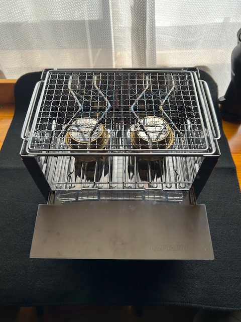 2人で楽しむ時は次のように、キャプテンスタッグのカマド スマートグリル B5型に、アルコールバーナーを2個置いて使っています。